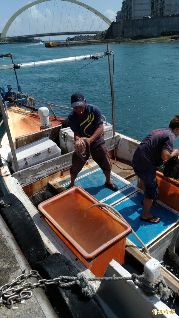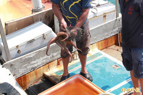 該男子購買的活章魚在漁民手中蠕動,最後被丟到港裡。(記者吳政峰攝)