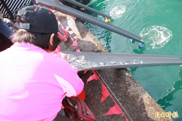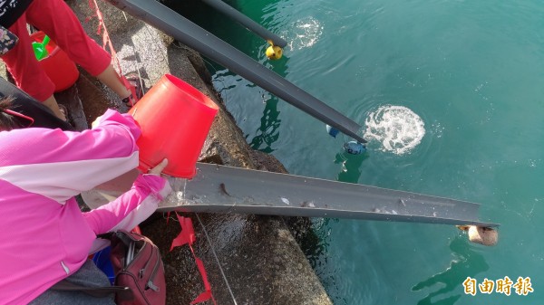 合法的放生活動需要經過申請,才能在漁港內放流。魚苗透過魚梯游進大海,才不會受傷。(記者吳政峰攝)