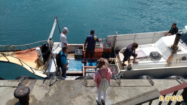 男子購買的活海產則單獨放在另一艘較大的船上,種類有三點蟹、章魚等高單價的經濟海產,甚至還有一般人想買還買不到的「椰子渦螺」,非常罕見,因為數量龐大,攤商出動6人,約20分鐘才搬完。