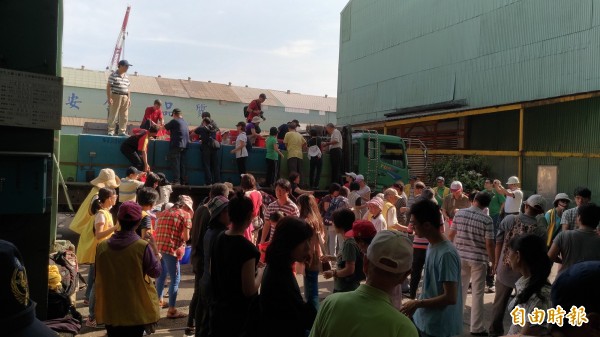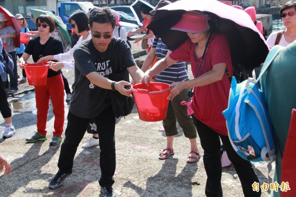 宗教團體用接力的方式,傳送魚苗入海。(記者吳政峰攝)
