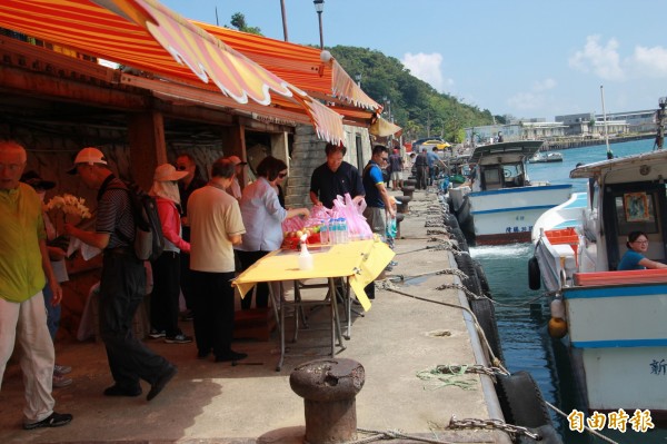 和平島岸邊有不少漁船幫忙載運放生,上還貼有神明圖。(記者吳政峰攝)
