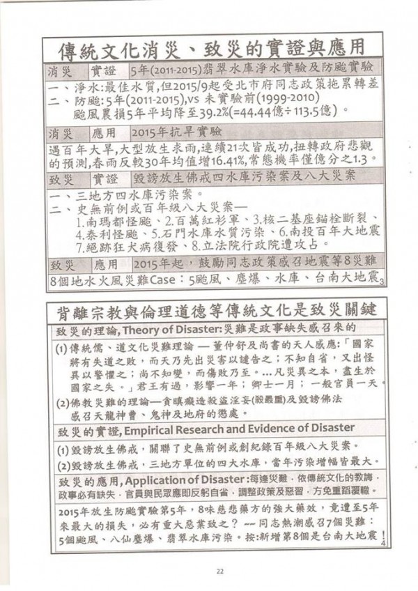 資料附錄是所謂「放生減災念力實驗」的實證與應用。稱放生不但讓翡翠水庫淨水到最佳水質、颱風農損降低、2015年大旱是靠放生求雨扭轉成功;而毀謗放生、鼓勵同志政策會導致災難,除強烈地震、颱風等天然災害外,狂犬病復發、八仙塵爆、紅衫軍、三一八學運也都被列為災禍。