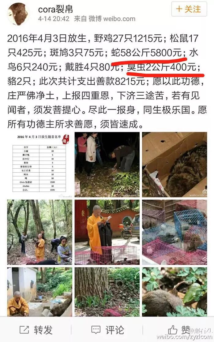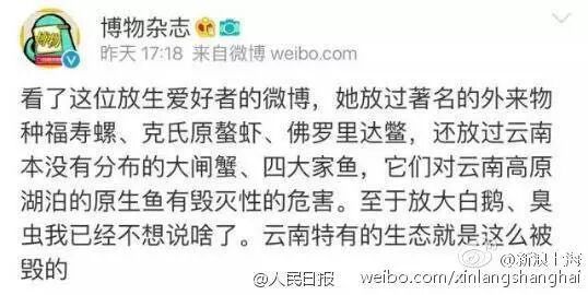 包括但不限于福寿螺、蛇、臭虫、巴西鳄龟、埃及塘鲺、非洲爪蟾、弗罗里达鳖、狐狸、貉……他们一边放生一边还要发微博周知。
