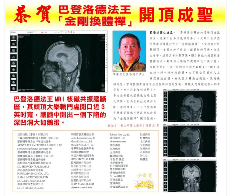 就這樣, 你幾乎不花一毛錢, 就可以輕易瞞天過海又免費照出並拿到"開頂成聖"的MRI影像圖了. 先讓台灣健保替你付費. 如果你要, 還可在公車火車坦克車上打廣告, 再讓台灣信徒把你當大聖德大法王敬拜供養.