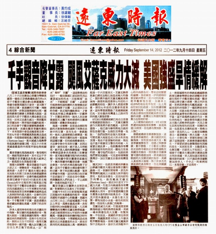 這篇華藏寺登的報導裡還說: (部分原文節錄: "26日的法會千手觀音確實殊勝感應, 法會過後, 美國在觀音菩薩的護佑下, 本來預期中會造成極度重災害, 有如7年前卡翠娜颶風對紐奧良造成重損, 有超強破壞能量之颶風艾薩克( Hurricane Isaac), 竟大減威力為熱帶性低氣壓時速僅12哩, 而56年來美國最嚴重的中西部旱情也得到緩解.")